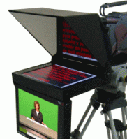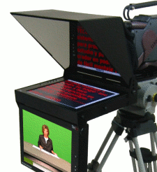 Este pequeño aparato se sujeta a la cámara delante del objetivo. Está compuesto por una pantalla en la que corre el texto y se sitúa en la parte de abajo del objetivo mirando hacia arriba. Delante del objetivo se pone un cristal inclinado 45º de la pantlla que está situada debajo. El texto que corre por la pantalla, se refleja en el cristal y el presentador lo que lle es ese reflejo del texto. Al ser un cristal lo que se situa delante del objetivo, no hay problema y deja que se vea lo que hay delante de la cámara.