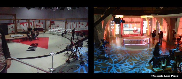 En estos tiempos de crisis, las televisiones -tanto públicas como privadas- cuentan con menos presupuesto para programas y para medios técnicos y humanos. Muchas veces en su afán de ahorrar costes, la distribución de los platós se hace en un mismo espacio. Me explico. Una nave suficientememte grande, alta e insonorizada en la que se van construyendo los distintos decorados de los programas. Voy a exponer a continuación varios ejemplos.